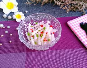 把萝卜去皮,用花刀切成长条,然后放一碗里用适量的盐腌制半小时。
