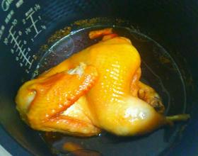 腌制好的鸡肉放到电饭锅做煮,水不要末过鸡,末到鸡肉的一半就好,在鸡肉上撒一点点的白沙糖!