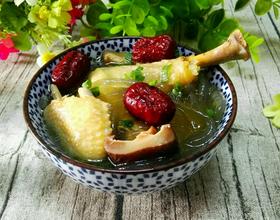 准备材料:鸡肉切块、粉条泡软剪成20厘米长、香菇泡发对半切开、红枣洗净。姜切片、葱切粒。