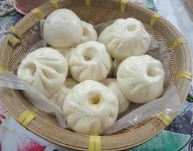 - 13. 杆成中间后四边薄的皮。(包子皮一定不能杆太薄,太薄发不好,).放入适量馅料。