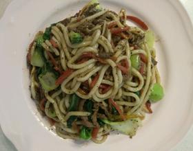 胡萝卜略软后加入青菜炒一分钟,放入牛肉丝、乌冬面、黑胡椒酱翻炒