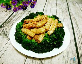 西兰花绰水,水中加盐,糖,油煮熟西兰花,捞起备用
