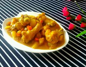 然后加水放小鸡肘,大火烧开转至小火炖。在煮熟前10分钟就把咖喱块放进去,搅拌粘稠,然后盖上盖子关火焖5分钟就可以开吃啦!
