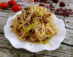 芹菜择掉叶子,老根。洗净切成寸段,猪肉洗净切丝放入碗内加入适量料酒,生抽,盐腌制十分钟,黄豆芽冲洗干净