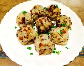 1.糯米最好选用细长型的,圆形的糯米容易蒸得太软,吃起来来粘稠。2.可加入十几粒花椒,今天用的香肠里有不少花椒,因此没有加。3.圆子一般要在正餐前提前做好,因此要在捏好后蒸第二次,如果正好在饭点做好就可以在成型后直接吃了,所以糯米要蒸熟,配料也要炒熟哦。