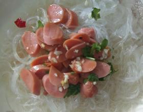 火腿切片放到碗里,先加一点酱油,再把半个蒜头和香菜、小辣椒切碎放进去