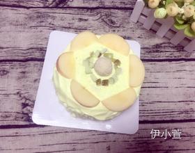 然后把顶部也抹上黄色奶油,切几片苹果摆出花瓣的样子