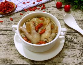 鸡脚去掉爪尖斩成两段洗净备用,花胶洗净切成小片备用、枸杞洗净备用、姜切片