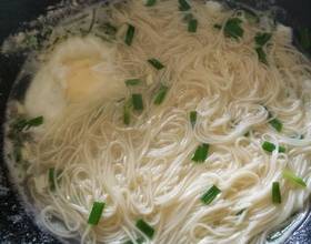 面条烧一分钟后加入洗净切好的香葱再烧一分钟即可,最后加麻油些许,配上一些小菜吃