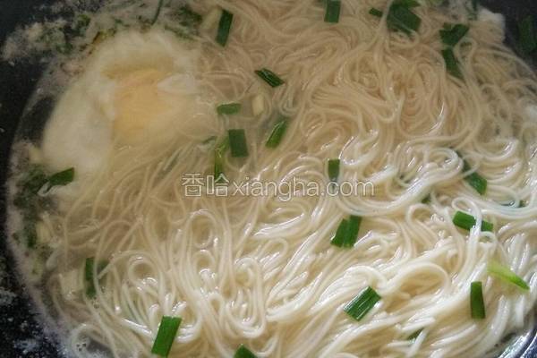 3.面条烧一分钟后加入洗净切好的香葱再烧一分钟即可,最后加麻油些许,配上一些小菜吃