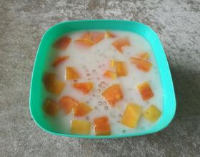 煮好的木瓜牛奶冷却十分钟,放入西米。等凉了放冰箱。