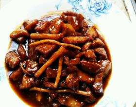 - 3. 热锅下油将梅花肉炒至微黄后盛出待用