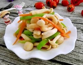 白玉菇去老根择洗干净,胡萝卜洗净切成丝,青椒洗净去蒂切成丝,