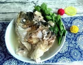- 5. 不粘锅放入油,5成热油放入鱼头煎至两面金黄即可。煎鱼头之前,可以在鱼头上撒上一些面粉,这样做不会糊锅。