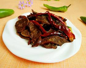 猪肺是新鲜卤好的,所以炒的时候不要炒很长时间。只需要用调料和辣椒的味道融入到肺里即可。