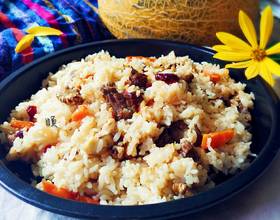 羊肉最好有点肥肉 渗透到米饭里会特别香应该用葡萄干和巴旦木 没有就用的蔓越莓干和核桃代替大米长粒的会更正宗 但是我们东北大米也不差