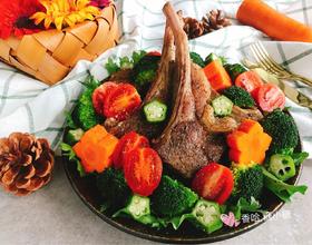 - 11. 把羊排放在洋葱上,用西兰花、圣女果、胡萝卜、秋葵装饰。最后撒上普罗旺斯香草。
