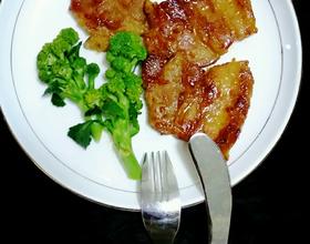 不粘锅放少许油,铺入肉片,小火,盖上锅盖,焖两三分钟,翻面,再焖两三分钟,此时可以看到有汤汁溢出。