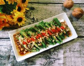 一个秋葵从中间切一分为二摆盘,洒上蒜沫,辣椒。