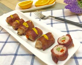 - 7. 培根片一切为2,铺好放入卷好的鸡肉卷,也是从放料的一头卷起,卷紧