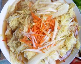 7分钟后放入葱姜胡萝卜丝,倒入料汁,再蒸2分钟