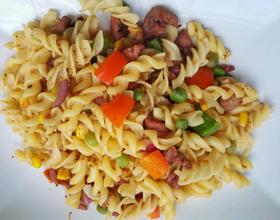 锅中放入热油,把提前腌制好的牛里脊肉丁炒熟,再放入洋葱和彩椒丁,最后再放入意面。