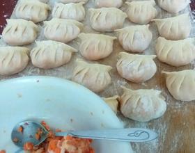 去适量馅料放入面皮中央,开始包,从一边开始打褶子,折到最后,把口收紧,以免下锅后露馅