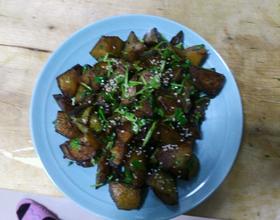 油锅烧热,放入花椒、干辣椒爆香,再放入葱和辣椒。香味一出,将炸好的土豆和茄子一起放入进行炒,加调料。放入香菜,拌匀。出锅装盘,撒上芝麻。完成!