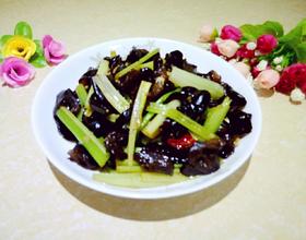 起油锅,爆香蒜未,倒入木耳片爆炒,加盐调味,加少量水盖锅盖焖一下。