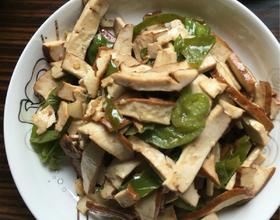 放入色拉油,待油热放入大蒜炒香,放入青椒翻炒,放入一点盐让青椒有咸味,因为香干是咸的等等就不用放盐了,青椒炒7分熟放入香干翻炒即可。