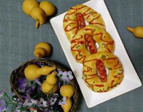 二发到位以后,表面刷全蛋液,用裱花袋分别挤上沙拉酱,番茄酱,撒上葱碎。