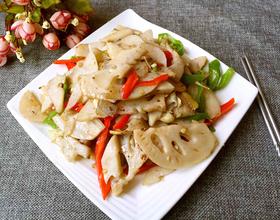 加辣椒大蒜翻炒均匀.加少许醋.保持藕片的脆爽