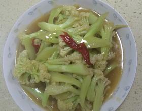 热锅加油,放入花菜青红辣椒翻炒