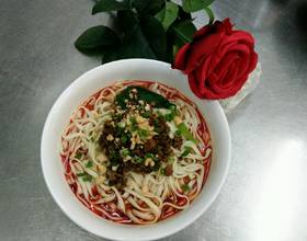 面上浇上提前炒制好的担担面哨子(在上一菜谱中有哨子详解,这里就不多说了)