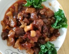 放入番茄沙司与猪肉,汁煮片刻