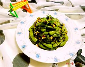 把油倒进碗里一起拌匀,淋在毛豆上即可。