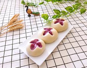 大致分成两份,先将紫薯泥倒入一部分面粉中,揉成光滑的面团,盖上保鲜膜发酵至两倍大。