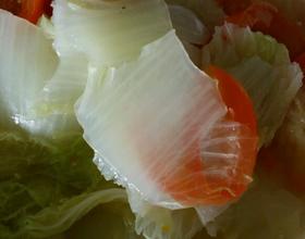 下白菜,先下菜帮,水再开,又下叶子,这样帮好熟。水再开放适量猪油和盐,记得油化前不要动锅及菜哦