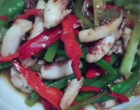 锅中热油先炒腌好的鱿鱼须 随后出锅