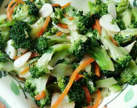 肉炒好放入香葱、蒜片炒出香味儿,放入红萝卜煸炒几下再放西兰花,微量酱油,适量盐,调入蔬之鲜,爆炒两分钟即可出锅。