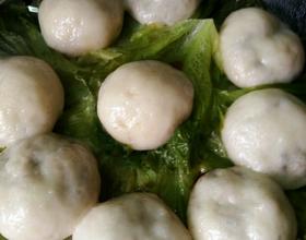 把弄好的糯米弄成团,在手上压扁了,发炒好的芽菜