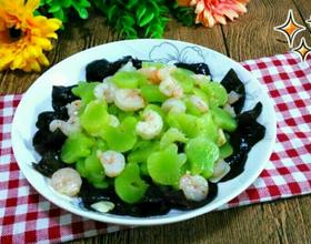 准备泡发好的黑木耳去根洗净,青笋(我用花刀切的)姜蒜切小片,虾仁我用的是冻虾仁。