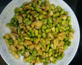 中火炒毛豆,入适量盐和糖,如果太干,可加少许清水,再倒入萝卜干混炒