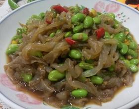 待熬好的汁冷却以后,浇在海蛰丝和青黄豆上,拌匀