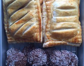 - 3. 四角对折压成长方形、之后再擀成薄饼、再对折、再擀成自己喜欢的厚度、用锋利的刀切成自己要做的形状2片、1片做底用叉子叉成小孔、上面放自己喜欢的水果、再把另一片放到刚刚放好水果的上面、最后用叉子把周围固定住、上面再用刀划几下就OK啦!