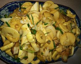把切好的配料倒锅里,跟鸡肉一起煸三分钟