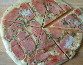 - 3. 把面团扞成薄片,倒上食用油刷均匀,撒上一点盐,从下往上卷起来。两头捏紧卷起来呈圆饼状,扞成薄饼状,火腿切成薄片放在饼上,用扞面棍轻轻碾压,使火腿肠薄片沾在饼上。电饼铛刷上一层食闹油,放入做好面饼,然后刷上鸡蛋韭菜混合液,盖好锅盖5分钟后即熟。