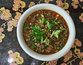 - 13. 放入苕粉.五香粉.胡椒粉.煮3分钟.加入芹菜.大葱.青椒.调料翻炒均匀即可.