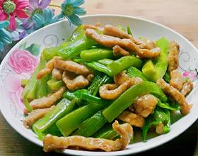 - 8. 放进莴笋丝和青椒丝翻炒。