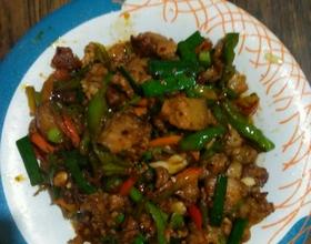 加入五花肉,大火翻炒五六下。依次加入耗油,生抽,老抽,盐,鸡精,老干妈!翻炒一两分钟后加入蒜叶出锅!